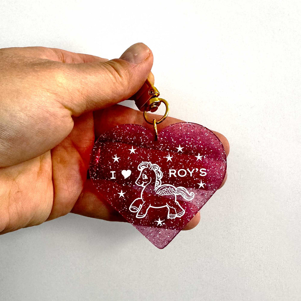 Translucent pink glitter keychain, featuring Baby Pegasus artwork by Carole Rast!